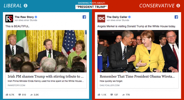 Nebeneinander präsentiert das WSJ die Feeds eines sehr liberalen und eines sehr konservativen Facebook-Users. Beide Feeds suchen nach dem gleichen Thema. Dennoch erstellt Facebooks Algorithmus zwei News-Ströme, die unterschiedlicher nicht sein könnten und erzeugt auf diese Weise Echokammern, in denen stets nur das eigene Weltbild genährt wird.