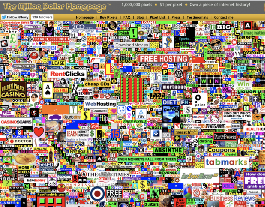 Als der Student Alex Tew im August des Jahres 2005 überlegte, wie er sein Studium finanzieren sollte, hatte er eine Idee, die ihn zum Millionär machen sollte. Er konzipierte eine Homepage, die aus einer Million Pixel bestand, die in einem 1.000-mal-1.000-Raster angeordnet waren. Diese Pixel verkaufte Tew für einen Dollar das Stück und war so bereits im Januar 2006 Millionär. (Screenshot: Million Dollar Homepage)