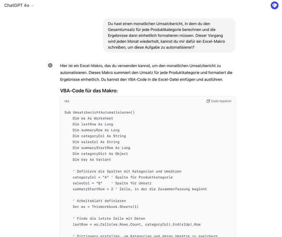 Praktischer Nebeneffekt: Auf die Art und Weise lernt ihr dann auch, wie VBA funktioniert. Zumal ihr ChatGPT auch jederzeit Fragen zu einzelnen Code-Bestandteilen stellen könnt.