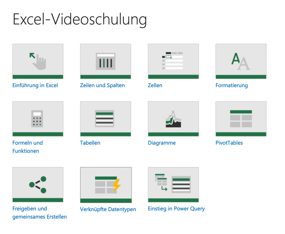 Im Netz gibt es eine ganze Reihe von Lernvideos und Tutorials zu Excel. Aber auch Microsoft bietet eigene Erklärvideos an. Die reichen von einer ersten Einführung über Formatierungsoptionen bis hin zu Formeln, PivotTables und Power Querys.