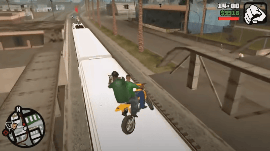Es war eine der schwierigsten Missionen. Bei „Wrong Side of the Tracks“ werden Protagonist CJ und sein Kumpel Big Smoke an einem Bahnhof angegriffen. Also musst du alle vier gegnerischen Gangmitglieder töten, bevor der Zug die Fredderick Bridge erreicht – und das alles auf einem Motorrad. Solltest du während der Mission von deinem Fahrzeug herunterfallen oder nicht alle Gegner erwischen, sagt Big Smoke seine ikonische Zeile: „All we had to do was follow the damn train, CJ.“ Wer die Mission damals gezockt hat, wurde durch den provokanten Satz zur Weißglut getrieben.