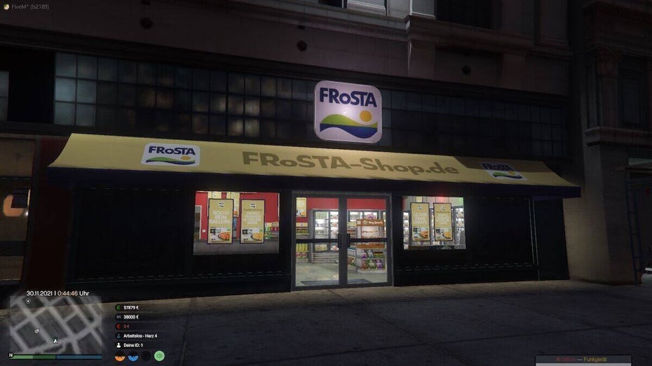 Auf einem Multiplayer-Server von „GTA“ wurden im Dezember 2021 die zum Überleben notwendigen Lebensmittel-Shops mit Frosta-Branding versehen. Die Shops waren nicht nur Deko, sondern funktionsfähig: Um zu überleben, müssen die Spieler:innen Essen und Trinken besorgen – das ebenfalls durch Frosta-Produkte ausgetauscht worden ist. (Bild: Frosta/JOM Group)