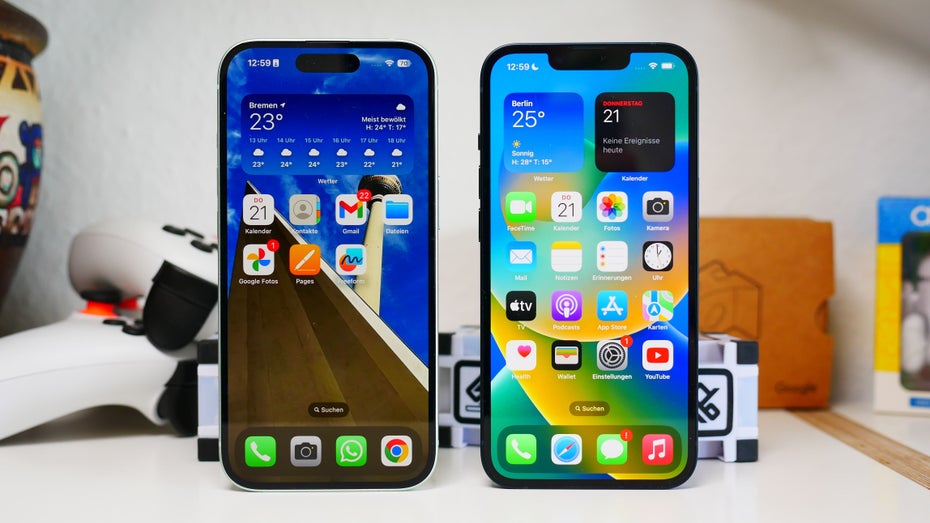 iPhone 15 Pro und iPhone 15 von vorn. Der Rahmen des Pro-Modells ist dünner als beim Basismodell.