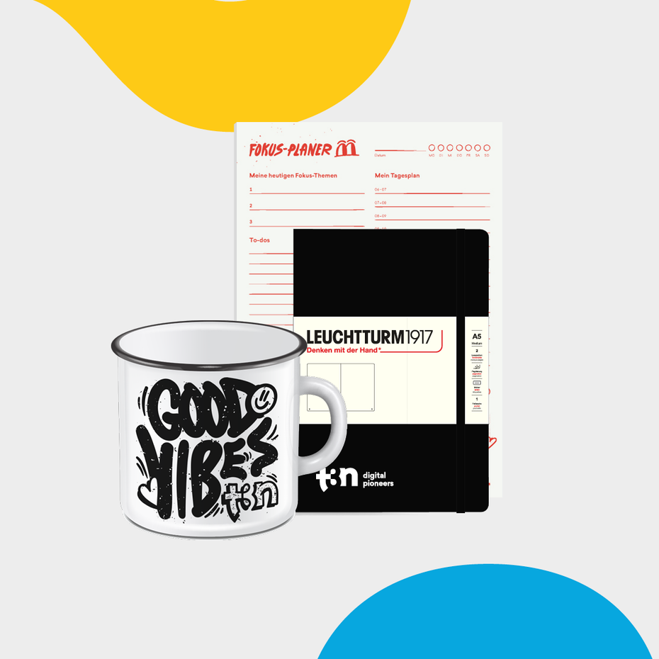 Plane deinen Tag mit Fokus-Planer und Notizbuch bei einem Kaffee aus der Good Vibes-Tasse.