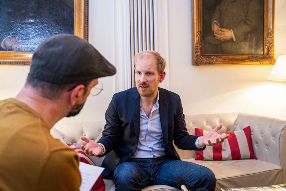 Der niederländische Historiker Rutger Bregman hat sich unter anderem mit einer Brandrede in Davos einen Namen gemacht. Im Interview mit Luca Caracciolo, Chefredakteur t3n Magazin, schlägt er freundlichere Töne an: „Die Menschen sind keine Engel, aber sie sind im Grunde gut.“ (Foto: Anna Fritsche)