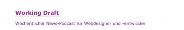 Working Draft (workingdraft.de) ist ein wöchentlicher News-Podcast für Webdesigner und -entwickler. In den Audio-Beiträgen unterhalten sich Branchenkenner zu Themen wie HTML5, CSS3 und aktuellen Tools wie Wunderkit und YAML 4.