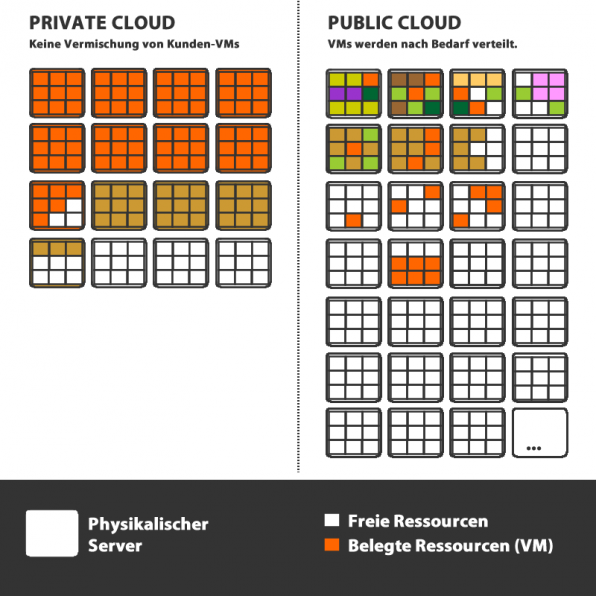 Während bei Private Clouds eine dedizierte Server-Umgebung die Basis bildet, bucht man bei Public-Cloud-Angeboten Instanzen in der Cloud-Umgebung des Hosters.