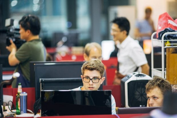 Felix Kiefl im Gespräch mit Mitarbeitern des HAX-Accelerators. (Foto: Vitaly Vyazovsky)