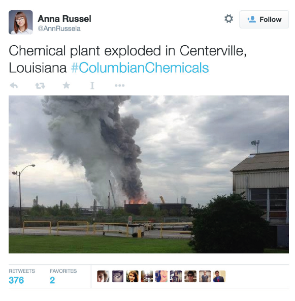 Auch schon vor der US-Wahl 2016 haben mutmaßlich russische Hacker Desinformationskampagnen verbreitet, wie diese fiktive Explosion einer Chemie-Fabrik in Louisiana. Der hier abgebildete Account ist inzwischen gesperrt. (Screenshot: Twitter / @AnnRussela)