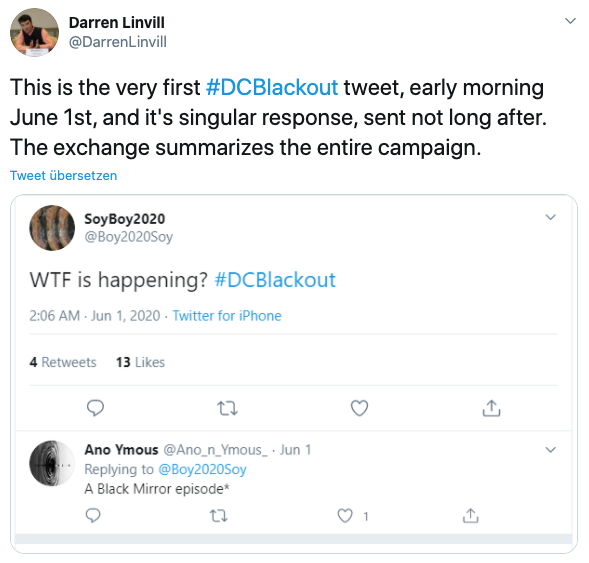 Der Wissenschaftler Darren Linvill versucht, auf Twitter über Desinformationskampagnen wie #DCBlackout im Sommer 2020 aufzuklären. Mithilfe von Fake-Personas und Bots wurde das Gerücht gestreut, US-Polizei und -Geheimdienste hätten als Schlag gegen die Black-Lives-Matter-Proteste das Internet in Washington gestört. (Screenshot: Twitter / @DarrenLinvill)