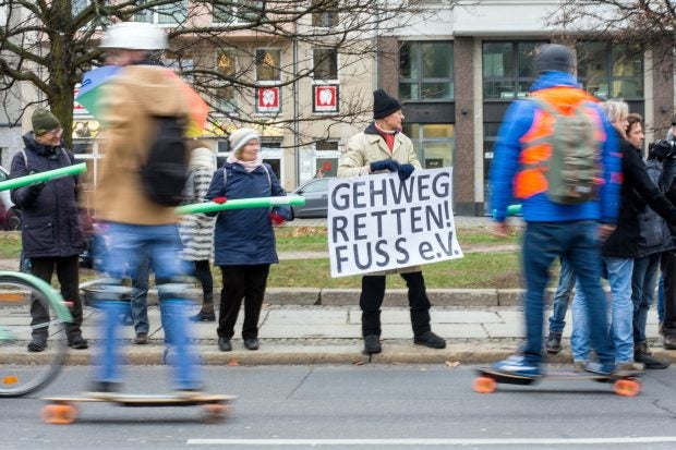 Auch in Deutschland scheinen solche Szenarien nicht unwahrscheinlich. Die bereits 2017 massenhaft von chinesischen Anbietern wie Obike oder Ofo aufgestellten Leihfahrräder in Berlin oder München wurden schnell zum Gespött. Nach wenigen Wochen lagen hunderte Schrotträder in den Straßen. Noch vor dem offiziellen Start richten sich jetzt auch erste Proteste gegen die neuen Elektrokleinstfahrzeuge. Als im Dezember knapp 200 Anhänger des E-Fahrzeug-Bündnisses Electric Empire mit Tretrollern, Mono-Wheels und Skateboards für die Legalisierung der Elektroflitzer durch Berlin zogen, brachten sich Gegendemonstranten mit Schwimmnudeln und Blindenstöcken in Stellung, um symbolisch die Gehwege zu versperren. Die Gegner fürchten sich vor rücksichtslosen Fahrern und der damit verbundenen Unfallgefahr. „Auf dem Gehweg sind Alte, Kinder, Seh- und Hörbehinderte unterwegs“, sagt Roland Stimpel, Sprecher der Fußgängervereinigung Fuss e. V. „Jetzt sollen E-Fahrzeuge bis zwölf Stundenkilometer dazukommen, das ist dreimal so schnell wie viele Fußgänger. Das wäre das Ende der entspannten Verhältnisse.“ Stimpel fordert, dass die Elektrokleinstfahrzeuge ausschließlich auf Radwegen und Fahrbahnen verkehren dürfen.