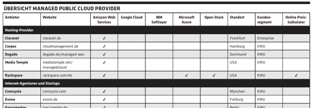 Auch in Europa gibt es etablierte Hosting-Anbieter, die einen ähnlichen Weg wie Rackspace und Media Temple gegangen sind – ganz nach dem Motto „If you can’t beat them, join them“. Hierzu zählen zum Beispiel die Firma Dogado aus Dortmund und Claranet, ein Managed-Service-Provider für Hosting- und Netzwerklösungen aus Großbritannien, der auf dem deutschen Markt stark präsent ist. Beide verfügen über eigene Rechenzentren und bieten mittelständischen und Großunternehmen klassische Hosting-Services. Gleichzeitig treten sie aber auch als Partner der großen IaaS-Provider auf und unterstützten Kunden bei der Administration ihrer Cloud-Systeme.