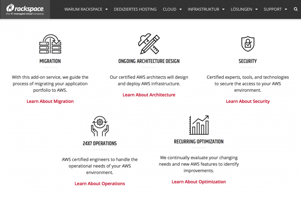 Solche Leistungen gehörten eigentlich schon immer zum Portfolio der traditionellen Hosting-Anbieter. Viele von ihnen haben deshalb den Siegeszug der Public Clouds als Chance genutzt und ihr Leistungsportfolio um Managed-Dienste für AWS, Azure und Co. erweitert. Ein gutes Beispiel ist Rackspace. Der Webhoster aus den USA zählt zu den größten Vertretern seiner Branche (1,7 Milliarden Dollar Umsatz) und versucht nun nicht mehr, nur seine eigenen Cloud-Infrastrukturen zu vermarkten. Stattdessen fokussiert sich Rackspace verstärkt auf Managed Services für AWS, Microsoft Azure und die OpenStack Cloud. Mit seinem Produkt „Fanatical Support für AWS“ bietet das Unternehmen als zertifizierter AWS Managed Service-Partner Beratung, Know-how, Support und sogar Application-Management für Amazon-Kunden. Die monatlichen Pauschalgebühren basieren auf den monatlichen AWS-Kosten des Anwenders und fangen schon bei 350 US-Dollar an.