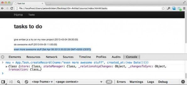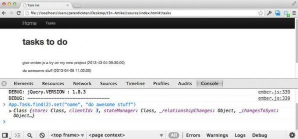 Die Model-Klasse legt fest, welche Attribute der Model Task hat (hier „name“ und „created_at“). Ohne dass man es angeben muss, erhält jede Klasse automatisch ein Attribut id mit dem Typ „integer“. Außerdem wird das berechnete Attribut „display_text“ definiert (mehr dazu unten). Die Fixtures definieren zwei Beispieldatensätze. Das heißt, die Beispiel-App generiert die Daten aus dem Sourcecode. In einem echten Projekt sollte man den REST-Adapter verwenden und die Daten aus einem Backendsystem laden.