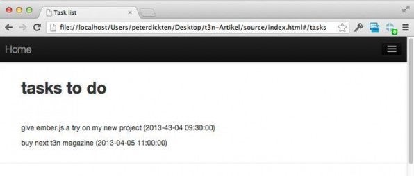 Ruft man den Code unserer erstellten App [4] auf und wechselt zu /index.html#/tasks, bietet sich folgendes Bild: