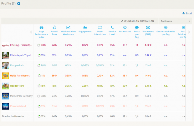 Das Werkzeug Fanpage „Karma“ analysiert unbegrenzt viele Profile – in diesem Fall vergleicht es die Profile deutscher Freizeitparks. (Screenshot: Fanpage Karma)