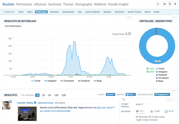 Das Dashboard der Lösung „Talkwalker“ liefert umfangreiche Analytics-Daten – in diesem Beispiel zum CommunityCamp 2017 mit Treffern pro Stunde und Verteilung nach Medientypen. (Screenshot: Talkwalker)