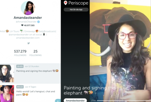 Amanda Oleander war eine der ersten, die das Potenzial der neuen App erkannte. Die bis dahin völlig unbekannte Illustratorin begann kurz nach dem Start von Periscope, regelmäßig Szenen aus ihrem Leben zu filmen und zu teilen. In nur knapp einem Monat wurden ihre Videos mehr als sieben Millionen mal „geloved“, also das, was auf Facebook „geliked“ heißen würde. Sie streamt sich beim Malen und beim Kochen und nimmt ihre Zuschauer auch schon mal mit, wenn sie sich ihre Beinhaare weglasern lässt. Das Reizvolle für die Nutzer: Sie können ihr direkt während des Live-Streams Nachrichten schreiben. Dann poppt für alle Welt sichtbar ein kleines Dialogfenster im Stream auf und im besten Fall gibt Amanda Oleander auch direkt eine Antwort.
