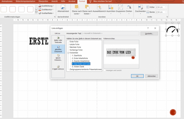 Der Trick ist nun, dass ihr diesen Ausstieg von jeder Folie aus direkt anspringen könnt, wenn Zeitverzug entsteht. Ihr wollt am Ende nicht zehn Folien schnell durchklicken, um zum wichtigen Ende zu kommen. Also setzt einen versteckten Hyperlink auf die Masterfolie, der auf die erste Folie der Ausstiegssequenz zeigt.