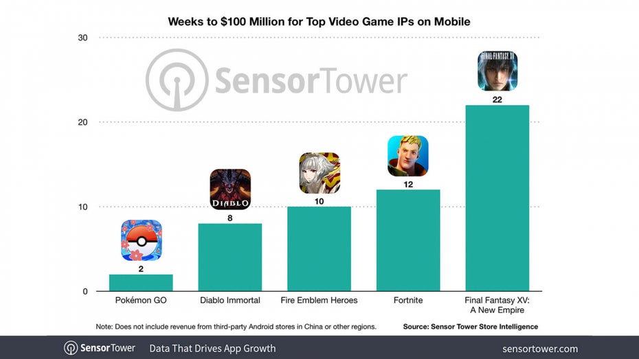 Diese Zahlen gehen aus einem Bericht der Analytics-Plattform Sensor Tower hervor, welche Diablo und andere Mobile-Spiele im Auge behält. Das einzige Mobile-Game, welches schneller die 100 Millionen Dollar eingenommen hat, ist das immer noch sehr beliebte Pokemon Go. Das hat gerade einmal zwei Woche gebraucht. Hinter Diablo steht Dire Emblem Heros mit 10 Wochen, gefolgt von Fortnite mit 12 Wochen nach Start und anschließend Final Fantasy XV: A New Empire, was insgesamt 22 Woche brauchte. Die komplette Grafik seht ihr hier: