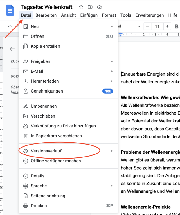 Fehler gemacht? Version verloren? Schauen, was man geändert hat? Google Drive speichert bis zu 100 Versionen eurer Dokumente für 30 Tage – von PDF über Bild bis zur MP3. Um auf die früheren zuzugreifen, müsst ihr einfach auf „Datei“ klicken, dann auf „Versionsverlauf“ und schließlich auf „Versionsverlauf anzeigen“.