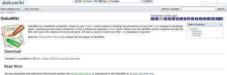 Das vom Deutschen Andreas Gohrs erstmals 2004 vorgestellte DokuWiki ist in PHP programmiert und benötigt keine Datenbank. Neben einem WYSIWYG-Editor gibt es auch Templates und Add-Ons. Die Wikisoftware steht unter einer GPL2-Lizenz.