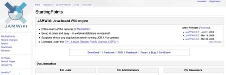 JAMWiki ist eine Nachbildung unter Java des bekannten MediaWikis (das auch die Wikipedia einsetzt) und setzt auf dieselben Wiki-Syntaxen. JAMWiki kam erst im Juni 2008 auf den Markt und ist somit noch relativ neu. Es ist möglich, JAMWiki entweder mit einer internen oder einer externen Datenbank laufen zu lassen, die Funktionen überschneiden sich mit denen des Vorbilds MediaWiki.