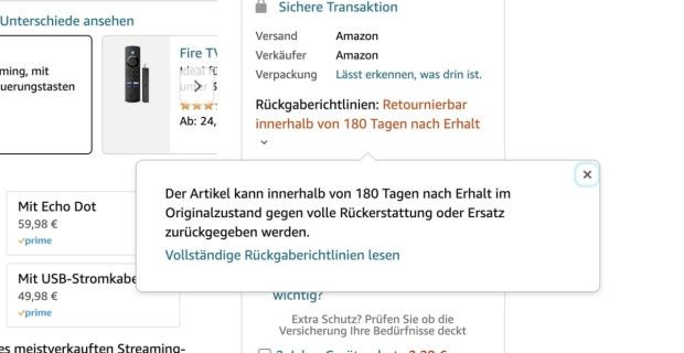 Ein Beispiel für eine 180-tägige Rückgabemöglichkeit. (Screenshot: Amazon)