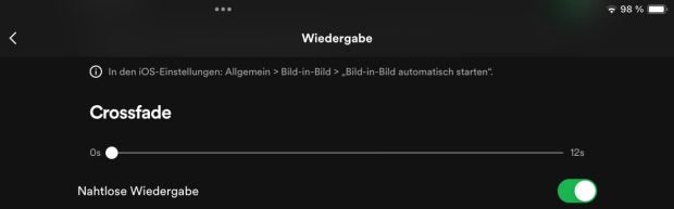 Wenn euch die kurzen Momente der Stille zwischen den Songs eurer Playlist stören, dann könnt ihr unter Einstellungen und Datenschutz im Untermenü Wiedergabe die Crossfade-Funktion aktivieren.