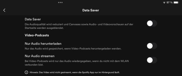 Durch Aktivierung des Data Savers wird die Audioqualität automatisch auf die niedrigste Stufe eingestellt. Außerdem werden zusätzliche Animationen sowie Audio- und Videovorschau deaktiviert. Im selben Menü könnt ihr optional auch dafür sorgen, dass auch Video-Podcasts nur als Audio gestreamt und heruntergeladen wird.