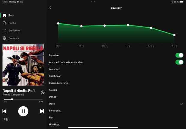Die Funktion findet ihr in Spotify, wenn ihr im Menü Einstellungen und Datenschutz auf Wiedergabe und dort auf Equalizer geht. In dem sich öffnenden Menü könnt ihr dann entweder eigenhändig Einstellungen vornehmen, oder wählt eines der Presets aus.