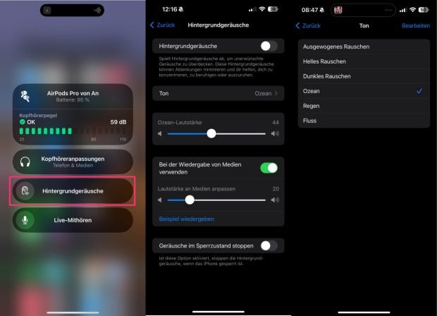 Diese Funktion findet ihr per Schnellzugriff auch im Kontrollzentrum in der neuen Option oder in Einstellungen > Bedienungshilfen > Audio & Visuelles. Bei den Hintergrundgeräuschen könnt ihr aus verschiedenen Optionen wie Ozean, Regen, Fluss und anderen wählen. Ebenso lässt sich hier die Standardlautstärke der Geräusche festlegen.
