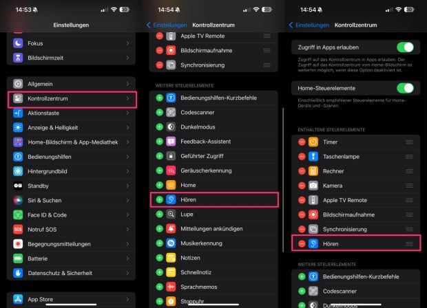 Um diese Zusatzeinstellungen zu erhalten, müsst ihr zunächst die Hören-Option zum Kontrollzentrum hinzufügen. Das erfolgt über die Einstellungen und den Punkt Kontrollzentrum. Hier sucht ihr „Hören“ und tappt auf das Plus-Symbol. Nun zeigt sich in den Schnelleinstellungen ein neues Ohr-Icon. Ein Tap darauf bringt euch nun zu vielen weiteren Optionen.