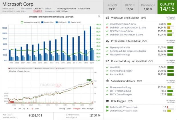 Traderfox-Chartanalyse: Microsoft-Aktien weisen hohe Wertpapier-Qualität auf. (Screenshot: Traderfox/t3n)