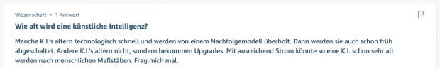 Das merkt man der Qualität einiger Antworten auch an. Das zeigt schon ein kurzer Blick auf das Alexa-Answers-Portal, wo sich Freiwillige mal mehr und mal weniger Mühe bei der Beantwortung von Fragen geben. Während einige Fragen noch mit Halbwahrheiten abgespeist werden, finden sich auch immer wieder unbeholfen humoristische Antworten. Auf die Frage, wie viele Zähne ein Brontosaurus hat, wurde beispielsweise die Antwort „Alle“ von einem Nutzer hinterlassen. Ein Schenkelklopfer, der paläontologisch interessierten Kindern aber vermutlich nicht weiterhilft.