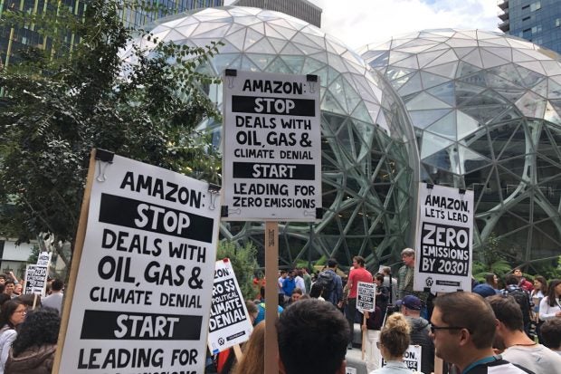 Mitglieder der Mitarbeiterinitiative Amazon Employees for Climate Justice präsentieren beim globalen Klimastreik am 20. September 2019 ihre Hauptforderungen auf Plakaten. Im Hintergrund: die Amazon Spheres in Seattle. (Foto: DPA)
