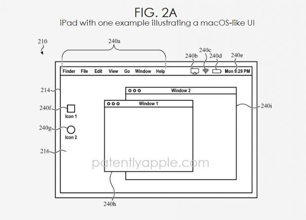 Bei Verbindung mit entsprechendem Zubehör kann das iPad laut Patent eine macOS-Oberfläche genutzt werden. (Bild: USPTO; Patently Apple)