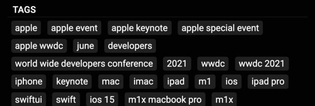 Wie Balzer auf Twitter erklärt, konnte er die Tags der WWDC-Keynote auf Youtube mit der Browser-Erweiterung Tubebuddy auslesen. Weitere Tags sind iOS 15, Swift UI, Apple WWDC, Apple Keynote aber auch iPhone, iMac und iPad. Solche Tags werden als Maßnahme zur Suchmaschinenoptimierung genutzt, um Videos für Nutzer besser auffindbar zu machen und deren Reichweite zu erhöhen.