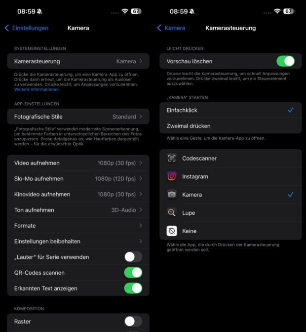 Für Apple ein wenig ungewöhnlich könnt ihr in den Einstellungen sogar verschiedene Kamera-Apps auswählen, falls ihr das iPhone etwa primär für Instagram, Snapchat oder Tiktok verwendet. Aber auch weitere Apps für ambitioniertere Foto- und Videofans wie Halide oder Black Magic Kamera sind möglich. Für Kreative hat Apple so ein bequemes Tor zur Contenterstellung parat.