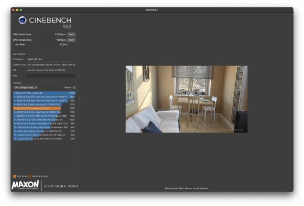 In Cinebench R23 liefert der M2-Ultra-Chip ausgezeichnete Werte. (Screenshot: Cinebench/t3n)