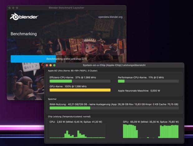 Für unseren Test stand uns ein Mac Studio mit dem 76 GPU-kernigen M2 Ultra, 128 Gigabyte RAM und vier Terabyte SSD-Speicher zur Verfügung.