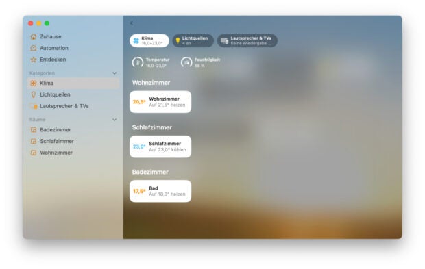 Dank Homebridge könnt ihr eure AVM-Thermostate über die Home-App steuern. (Screenshot: Home-App für macOS / t3n)