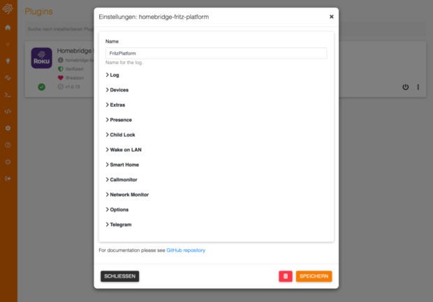 Über die Suchfunktion könnt ihr jetzt das Plugin Homebridge Fritz Platform aufspüren und installieren. Anschließend müsst ihr das Plugin konfigurieren. Dazu empfiehlt es sich, in einem zweiten Fenster das Web-Interface eurer Fritzbox zu öffnen.