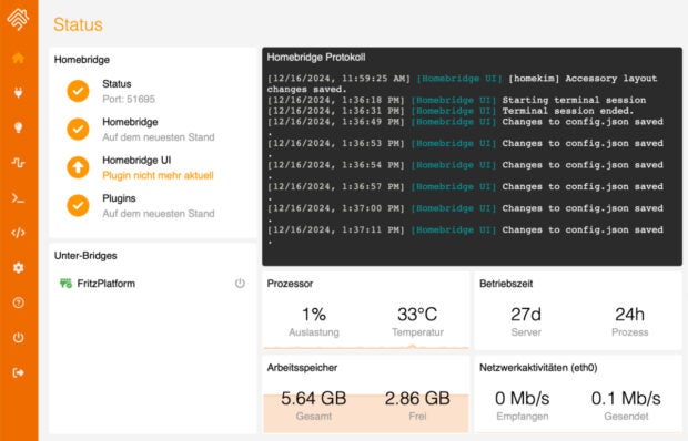 Nachdem ihr einen Nutzer:innen-Namen und ein Passwort festgelegt habt, gelangt ihr auf die Übersichtsseite. Hier findet ihr Informationen zu eurer Hardware und eurer Homebridge-Installation. Jetzt solltet ihr in den Plugin-Bereich wechseln. Den findet ihr unter dem Steckersymbol in der Navigationsleiste auf der linken Fensterseite.