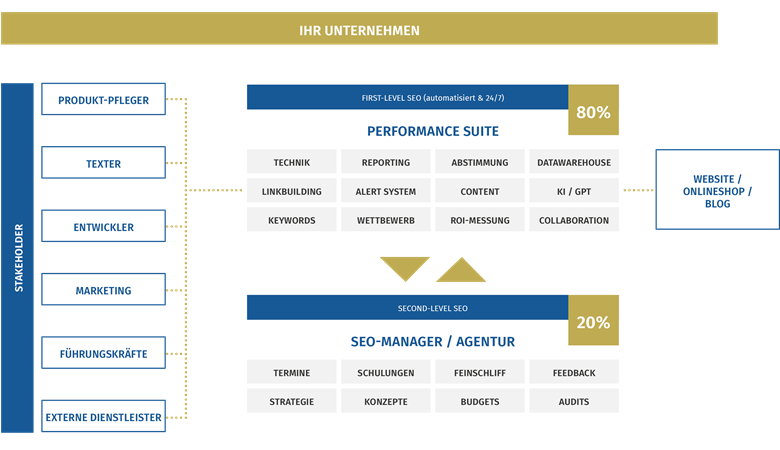 Bei First-Level-Aufgaben geht es darum, Standardprozesse wie das Auffinden neuer Keywords, Content-Erstellung, technische Checks und Reporting zu automatisieren. Ein fortschrittliches Tool in diesem Bereich ist die Performance Suite (PS), die genau diese Automatisierung ermöglicht.