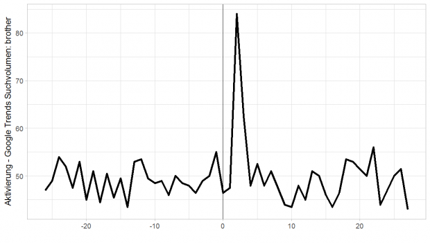 Das Google-Suchvolumen für den Begriff „Brother“ in den 30 Minuten vor und nach der Ausstrahlung. (Screenshot: Google Trends)