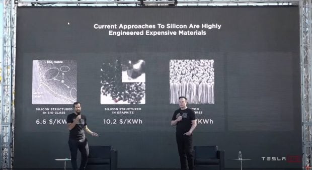 Bei den Materialien will Tesla Grafit durch Silizium ersetzen und dabei bestehende Komposite entbehrlich machen. Silizium würde dabei als Rohmaterial für die Anode verarbeitet. Die Kosten pro Kilowattstunde sänken dadurch auf 1,20 Dollar pro Kilowattstunden. Die Kathodentechnik will Tesla ohne Kobalt und unter stärkerem Nickeleinsatz unter Beifügung weiterer Metalle herstellen und dabei den Herstellungsprozess komplett neu konzipieren. Ein neues Kathodenwerk soll im Zusammenhang mit der geplanten neuen Batteriezellfabrik entstehen.