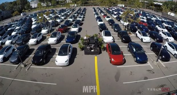 Die Event-Bühne war auf einem Parkplatz errichtet worden. Das Publikum schaute aus den Tesla-Fahrzeugen heraus zu. – Autokino-Feeling. (Screenshot: t3n)