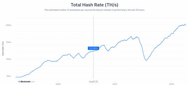 Am 12. Februar 2021 hatte die Bitcoin-Hashrate mit 248,11 EH/s das bisherige Allzeithoch erreicht. Deutlich wichtiger als die Betrachtung der einzelnen Tage ist allerdings der Siebentages- bzw. 30-Tages-Durchschnitt. Denn innerhalb eines Tages kann es zu größeren Schwankungen kommen. Dass die Bitcoin-Hashrate auch langanhaltend steigt, zeigt ein Blick auf den 30-Tages-Durchschnitt der letzten drei Jahre. Erst vor wenigen Tagen, am 30. März 2022, stieg die Bitcoin-Hashrate im 30-Tages-Mittelwert auf 202 EH/s an.