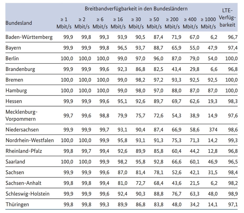 Dabei wäre es vielen Kunden gar nicht mal wichtig, eine derart schnelle Leitung zu haben. In den meisten Bundesländern sind 200 MBit/s immerhin in mehr als der Hälfte der Haushalte verfügbar, lediglich Brandenburg, Sachsen-Anhalt und Thüringen schnitten hier mit 40 bis 50 Prozent Verfügbarkeit schlechter ab. Bei den Anschlüssen, die mindestens 16 MBit/s schnell sind, können dagegen die meisten Bundesländer überzeugen. Lediglich Mecklenburg-Vorpommern (79,9 Prozent) und Sachsen-Anhalt (81 Prozent) fallen hier unangenehm auf.